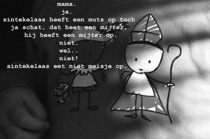 | was het niet de verwarring omtrent de muts die sint ophad onderweg naar nederland ipv de mijter ? daar snapte Peuter namelijk de balle van hahaha en die sint en piet poppetjes staan op ons zeeman-vermaak-blok maar daar had je dus ook truitjes van ? leuheuk !!! zitten jullie straks ook voor de tv om 12 uur ?!! wij wel (ik nog met een h alf hoofd vol watten enzo grmbl maar enfin) en morgen komt ie hier met de reddingsboot ipv stoomboot over verwarring gesproken en daar gaan we ook bij zijn whiiiiiiiiiiiiiii als sint dit meisje maar nie op eet !!! | ||