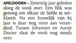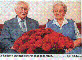 | Dat is mooi, zoveel jaren samen. Niet zoveel mensen kunnen dat zeggen, 65 jaar getrouwd. Dat moet toch in de krant. Veel plezier op het feest. |